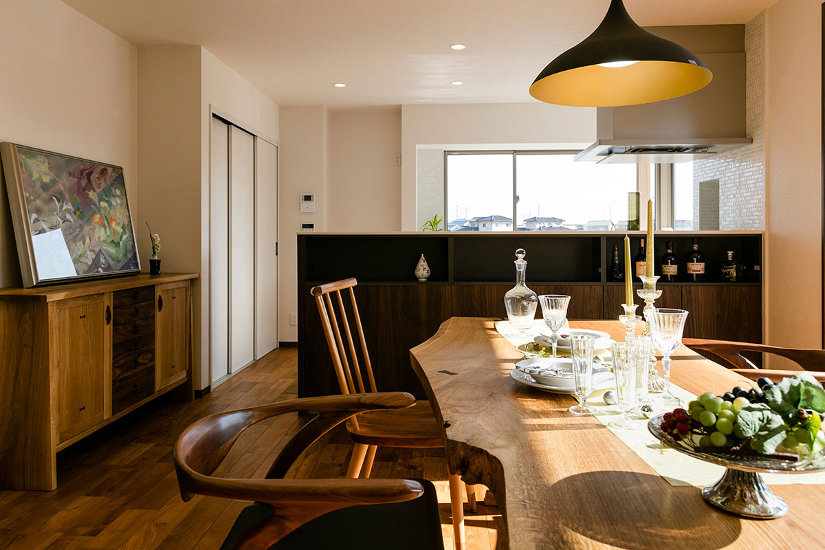 たくさんの「木材」を使っていただきました。この木材選びは楽しかったですね。結果、とても温かみのある素敵な家になったと思います。特にダイニングにはこだわりました。定形ではないテーブルとか、いろんな形の椅子とかライトとか。選ぶ際は、石川さんからたくさんご提案いただき、楽しみながら進めることができたことに感謝です。