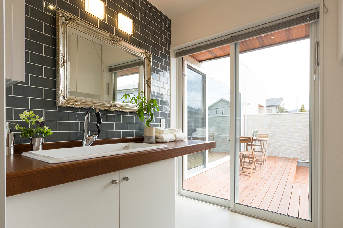 サニタリーには庭の陽光を取り込めるクリアガラスの掃き出し窓を。「緑を見ながら入浴したい」という奥さまの希望で、バスルームからも庭を眺められるよう設計しています。